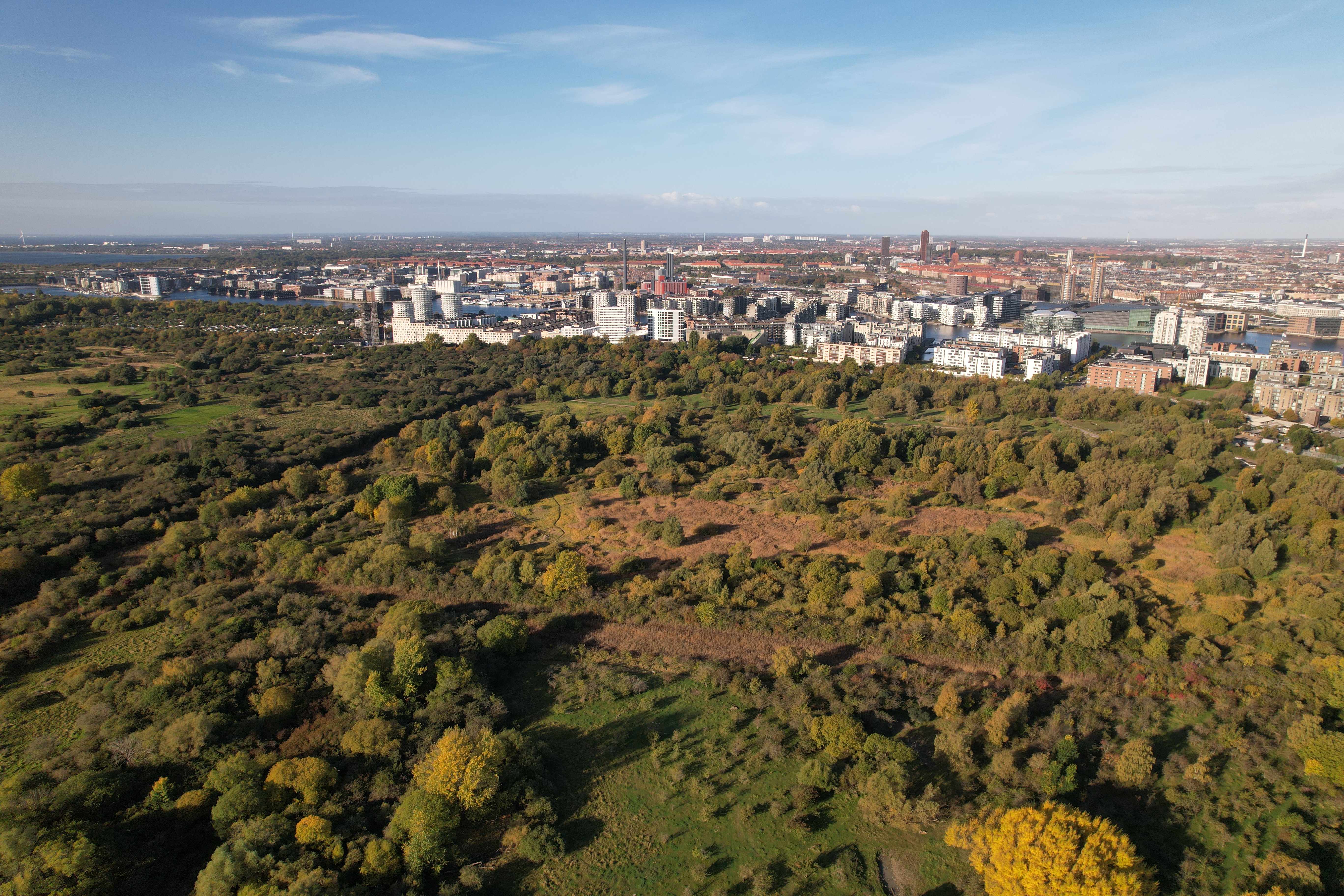 #amager fælled #copenhagen #nature reserve #urban skyline #cityscape #autumn trees #green space #aerial view #parkland #mixed forest #residential buildings #contrast nature city #outdoor recreation